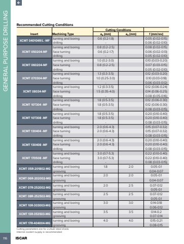 116 ISCAR GENERAL PURPOSE DRILLINGRecommended Cutting ConditionsInsert Machining TypeCutting Conditionsap (mm) ae (mm) f (mm/rev)XCMT 040104R/L -MF turning and boring 0.6 (0.2-1.8) 0.05 (0.02-0.15)drilling - 0.06 (0.02-0.10)XCMT 050204-MFturning and boring 0.8 (0.2-2.5) 0.08 (0.02-0.15)face turning 0.6 (0.2-1.7) 0.06 (0.02-0.13)drilling - 0.05 (0.02-0.10)XCMT 060204-MFturning and boring 1.0 (0.2-3.0) 0.10 (0.03-0.20)face turning 0.8 (0.2-2.5) 0.07 (0.03-0.15)drilling - 0.05 (0.02-0.10)XCMT 070304-MFturning and boring 1.3 (0.3-3.5) 0.12 (0.03-0.20)face turning 1.0 (0.25-3.0) 0.10 (0.03-0.18)drilling - 0.06 (0.03-0.12)XCMT 08034-MFturning and boring 1.2 (0.3-3.5) 0.12 (0.06-0.24)face turning 1.5 (0.35-4.0) 0.14 (0.06-0.25)drilling - 0.08 (0.05-0.16)XCMT 10T304 -MFturning and boring 1.8 (0.5-3.5) 0.12 (0.06-0.30)face turning 1.8 (0.5-3.5) 0.12 (0.06-0.30)drilling - 0.08 (0.03-0.15)XCMT 10T308 -MFturning and boring 1.8 (0.5-3.5) 0.20 (0.10-0.40)face turning 1.8 (0.5-3.5) 0.20 (0.10-0.40)drilling - 0.08 (0.03-0.15)XCMT 130404 -MFturning and boring 2.0 (0.6-4.3) 0.15 (0.07-0.32)face turning 2.0 (0.6-4.3) 0.15 (0.07-0.32)drilling - 0.08 (0.03-0.15)XCMT 130408 -MFturning and boring 2.0 (0.6-4.3) 0.20 (0.10-0.40)face turning 2.0 (0.6-4.3) 0.20 (0.10-0.40)drilling - 0.08 (0.03-0.15)XCMT 170508 -MFturning and boring 3.0 (0.7-5.3) 0.22 (0.10-0.40)face turning 3.0 (0.7-5.3) 0.22 (0.10-0.40)drilling - 0.08 (0.03-0.15)XCMT 05R-201802-MG turning and boring 1.8 2.0 0.05-0.1grooving 0.04-0.07XCMT 06R-202002-MG turning and boring 2.0 2.0 0.05-0.1grooving 0.04-0.07XCMT 07R-252002-MG turning and boring 2.0 2.5 0.07-0.12grooving 0.05-0.1XCMT 08R-252502-MG turning and boring 2.5 2.5 0.07-0.12grooving 0.05-0.1XCMT 10R-303003-MG turning and boring 3.0 3.0 0.14-0.18grooving 0.06-0.12XCMT 13R-353503-MG turning and boring 3.5 3.5 0.14-0.2grooving 0.07-0.14XCMT 17R-404004-MG turning and boring 4.0 4.0 0.15-0.21grooving 0.08-0.15Cutting parameters are for 2.25xD steel shankInternal coolant supply is recommended