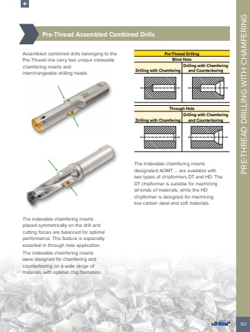 157PRE-THREAD DRILLING WITH CHAMFERING %u00bd%u0009Pre-Thread Assembled Combined DrillsAssembled combined drills belonging to the Pre-Thread line carry two unique indexable chamfering inserts and interchangeable drilling heads. The indexable chamfering inserts placed symmetrically on the drill and cutting forces are balanced for optimal performance. This feature is especially essential in through hole application. The indexable chamfering inserts were designed for chamfering and counterboring on a wide range of materials with optimal chip formation.Pre-Thread DrillingBlind HoleDrilling with ChamferingDrilling with Chamfering and Counterboring Through HoleDrilling with ChamferingDrilling with Chamfering and Counterboring The indexable chamfering inserts designated AOMT %u2026 are available with two types of chipformers DT and HD. The DT chipformer is suitable for machining all kinds of materials, while the HD chipformer is designed for machining low carbon steel and soft materials.