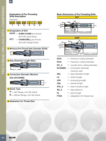 164 ISCAR PRE-THREAD DRILLING WITH CHAMFERING Explanation of Pre-Threading Drills Description Example:DCNT 085 - 026 - 12 A - M101 2 3 4 5 61 Designation of Drill DCNT%u2014 SUMO-CHAM pre-thread drill with spiral flutes DCT %u2014 CHAM-DRILL pre-thread drill with straight flutes2 Minimum Pre-Thread Hole Diameter (DCN)DCN 3 Step Diameter Length (SDL)SDL4 Connection Diameter Machine Side (DCONMS)DCONMS5 Shank TypeA%u2014 with flange, one flat shankB%u2014 without flange, one flat shank6 Adaptation for Thread SizeBasic Dimensions of Pre-Threading DrillsDCTDCONMSLSOALLPRLUSD_2SDL DCN-DCXPL DC_2 STA_2DCNTLTA LSSDLSD_2LUDCONMSOALDCN-DCX PL DC_2 STA_2DCN %u2014 minimum cutting diameterDCN %u2014 maximum cutting diameterDC_2 %u2014 counter bore cutting diameterDCONMS %u2014 connection diameter machine sideSDL %u2014 step diameter lengthLS %u2014 shank lengthLPR %u2014 protruding lengthOAL %u2014 overall lengthSTA_2 %u2014 step included angleSD_2 %u2014 step distancePL %u2014 point lengthFTDZ %u2014 adaptation for thread size