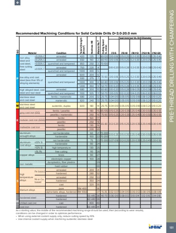 181PRE-THREAD DRILLING WITH CHAMFERING Recommended Machining Conditions for Solid Carbide Drills D=3.0-20.0 mmISOMaterial Condition Tensile Strength [N/mm2]Hardness HBMaterial No.(1)Cutting Speed Vc m/minFeed (mm/rev) Vs. Drill Diameter%u00d83-5 %u00d85.1-8 %u00d88.1-12 %u00d812.1-16 %u00d816.1-20Pnon-alloy steel and cast steel, free cutting steel<0.25% C annealed 420 125 1 80-120 0.10-0.18 0.15-0.25 0.2-0.30 0.20-0.350.25-0.40%u22650.25% C annealed 650 190 2 80-110 0.10-0.18 0.15-0.25 0.2-0.30 0.20-0.350.25-0.40<0.55% C quenched and tempered 850 250 3 70-1000.10-0.20 0.15-0.28 0.2-0.35 0.20-0.380.25-0.42%u22650.55% Cannealed 750 220 4quenched and tempered 1000 300 5low alloy and cast steel (less than 5% of alloying elements)annealed 600 200 670-90 0.10-0.18 0.15-0.25 0.2-0.30 0.20-0.350.25-0.40quenched and tempered930 275 71000 300 8 60-80 0.10-0.18 0.15-0.25 0.2-0.30 0.20-0.350.25-0.401200 350 9 50-70 0.10-0.20 0.15-0.28 0.2-0.35 0.20-0.380.25-0.42high alloyed steel, cast steel and tool steelannealed 680 200 10 60-80 0.10-0.20 0.15-0.28 0.18-0.35 0.20-0.380.25-0.42quenched and tempered 1100 325 11 50-70 0.10-0.15 0.12-0.20 0.14-0.25 0.16-0.30 0.18-0.32stainless steel and cast steelferritic / martensitic 680 200 12 25-75 0.04-0.10 0.05-0.15 0.05-0.18 0.08-0.20 0.10-0.20martensitic 820 240 13 25-75 0.04-0.10 0.05-0.15 0.05-0.18 0.08-0.20 0.10-0.20M stainless steel and cast steel austenitic, duplex 600 180 14 25-75 0.04-0.10 0.05-0.15 0.05-0.18 0.08-0.20 0.10-0.20Kgray cast iron (GG) ferritic / pearlitic 180 15 85-105 0.15-0.25 0.20-0.350.25-0.450.30-0.500.35-0.55pearlitic / martensitic 260 16 75-90 0.15-0.25 0.20-0.350.25-0.450.30-0.500.35-0.55nodular cast iron (GGG)ferritic 160 1765-80 0.12-0.20 0.15-0.25 0.20-0.350.25-0.400.30-0.45 pearlitic 250 18malleable cast ironferritic 130 19pearlitic 230 20Naluminumwrought alloysnot hardenable 60 21 70-3000.10-0.25 0.15-0.35 0.25-0.450.30-0.500.35-0.55hardenable 100 22 70-200aluminumcast alloys%u226412% Sinot hardenable 75 23 70-300 0.07-0.18 0.12-0.25 0.20-0.350.25-0.450.30-0.50hardenable 90 24>12% Si high temperature 130 25copper alloys>1% Pb free cutting 110 26brass 90 27electrolytic copper 100 28non metallic duroplastics, fiber plastics 29hard rubber 30Shigh temperature alloysFe basedannealed 200 31hardened 280 32Ni or Co basedannealed 250 33hardened 350 34cast 320 35titanium alloys pure RM 400 36alpha+beta alloys, hardened RM 1050 37 15-35 0.02-0.07 0.04-0.10 0.06-0.12 0.08-0.15 0.08-0.18Hhardened steelhardened 55 HRC 38 40-70 0.06-0.10 0.08-0.12 0.10-0.14 0.12-0.16 0.14-0.18hardened 60 HRC 39chilled cast iron cast 400 40cast iron hardened 55 HRC 41As a starting value, the middle of the recommended machining range should be used, then (according to wear results), conditions can be changed in order to optimize performance.%u2022 When using external coolant supply only, reduce cutting speed by 10%%u2022 Use internal coolant supply when machining austenitic stainless steel