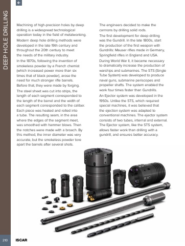 210 ISCAR DEEP HOLE DRILLINGMachining of high-precision holes by deep drilling is a widespread technological operation today in the field of metalworking.Modern deep hole drilling methods were developed in the late 19th century and throughout the 20th century to meet the needs of the military industry.In the 1870s, following the invention of smokeless powder by a French chemist (which increased power more than six times that of black powder), arose the need for much stronger rifle barrels. Before that, they were made by forging.The steel sheet was cut into strips, the length of each segment corresponded to the length of the barrel and the width of each segment corresponded to the caliber. Each piece was heated and rolled into a tube. The resulting seam, in the area where the edges of the segment meet, was smoothed with hammer blows. Then the notches were made with a broach. By this method, the inner diameter was very accurate, but the smokeless powder tore apart the barrels after several shots. The engineers decided to make the cannons by drilling solid rods.The first development for deep drilling was the Gundrill. In the late 1800s, start the production of the first weapon with Gundrills: Mauser rifles made in Germany, Springfield rifles in England and USA.During World War II, it became necessary to dramatically increase the production of warships and submarines. The STS (Single Tube System) was developed to produce naval guns, submarine periscopes and propeller shafts. The system enabled the work four times faster than Gundrills.An Ejector system was developed in the 1950s. Unlike the STS, which required special machines, it was believed that the ejection system was adapted to conventional machines. The ejector system consists of two tubes, internal and external. The Ejector system, like the STS system, allows faster work than drilling with a gundrill, and ensures better accuracy.