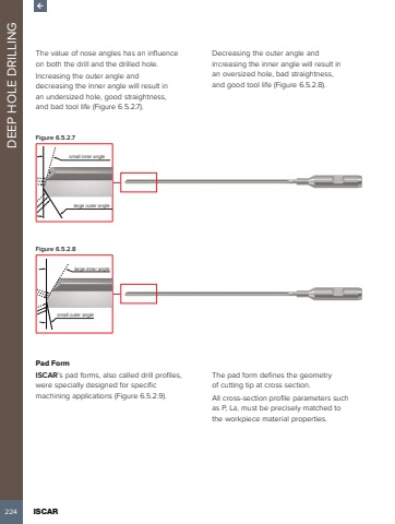 224 ISCAR DEEP HOLE DRILLINGThe value of nose angles has an influence on both the drill and the drilled hole.Increasing the outer angle and decreasing the inner angle will result in an undersized hole, good straightness, and bad tool life (Figure 6.5.2.7).Decreasing the outer angle and increasing the inner angle will result in an oversized hole, bad straightness, and good tool life (Figure 6.5.2.8).Figure 6.5.2.7small inner anglelarge outer angleFigure 6.5.2.8large inner anglesmall outer anglePad FormISCAR%u2019s pad forms, also called drill profiles, were specially designed for specific machining applications (Figure 6.5.2.9). The pad form defines the geometry of cutting tip at cross section. All cross-section profile parameters such as P, La, must be precisely matched to the workpiece material properties.