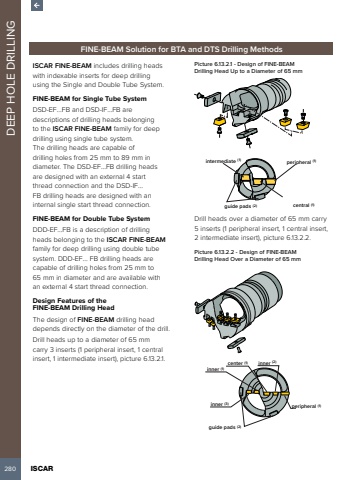 280 ISCAR DEEP HOLE DRILLINGFINE-BEAM Solution for BTA and DTS Drilling MethodsISCAR FINE-BEAM includes drilling heads with indexable inserts for deep drilling using the Single and Double Tube System.FINE-BEAM for Single Tube SystemDSD-EF%u2026FB and DSD-IF%u2026FB are descriptions of drilling heads belonging to the ISCAR FINE-BEAM family for deep drilling using single tube system. The drilling heads are capable of drilling holes from 25 mm to 89 mm in diameter. The DSD-EF%u2026FB drilling heads are designed with an external 4 start thread connection and the DSD-IF%u2026FB drilling heads are designed with an internal single start thread connection.FINE-BEAM for Double Tube SystemDDD-EF%u2026FB is a description of drilling heads belonging to the ISCAR FINE-BEAMfamily for deep drilling using double tube system. DDD-EF%u2026 FB drilling heads are capable of drilling holes from 25 mm to 65 mm in diameter and are available with an external 4 start thread connection.Design Features of the FINE-BEAM Drilling HeadThe design of FINE-BEAM drilling head depends directly on the diameter of the drill.Drill heads up to a diameter of 65 mm carry 3 inserts (1 peripheral insert, 1 central insert, 1 intermediate insert), picture 6.13.2.1.Picture 6.13.2.1 - Design of FINE-BEAMDrilling Head Up to a Diameter of 65 mmperipheral (1)central (1)intermediate (1)guide pads (2)Drill heads over a diameter of 65 mm carry 5 inserts (1 peripheral insert, 1 central insert, 2 intermediate insert), picture 6.13.2.2.Picture 6.13.2.2 - Design of FINE-BEAMDrilling Head Over a Diameter of 65 mmguide pads (2)center (1)inner (1)inner (2)inner (3)peripheral (1)