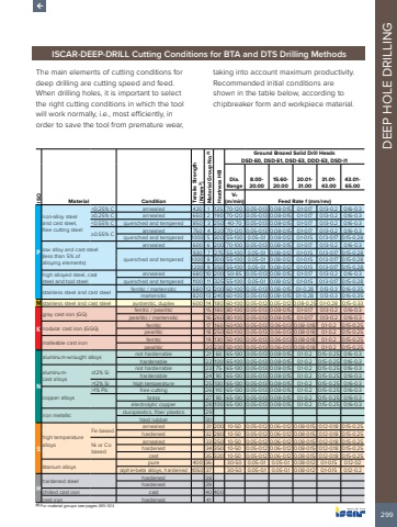 299DEEP HOLE DRILLINGISCAR-DEEP-DRILL Cutting Conditions for BTA and DTS Drilling MethodsThe main elements of cutting conditions for deep drilling are cutting speed and feed. When drilling holes, it is important to select the right cutting conditions in which the tool will work normally, i.e., most efficiently, in order to save the tool from premature wear, taking into account maximum productivity. Recommended initial conditions are shown in the table below, according to chipbreaker form and workpiece material.ISOMaterial Condition Tensile Strength [N/mm2] Material Group No.(1)Hardness HBGround Brazed Solid Drill Heads DSD-E0, DSD-E1, DSD-E3, DDD-E3, DSD-I1Dia. Range8.00-20.00 15.60-20.0020.01-31.0031.01-43.0043.01-65.00Vc(m/min) Feed Rate f (mm/rev)Pnon-alloy steel and cast steel, free cutting steel<0.25% C annealed 420 1 125 70-120 0.05-0.13 0.08-0.15 0.1-0.17 0.13-0.2 0.16-0.3%u22650.25% C annealed 650 2 190 70-120 0.05-0.13 0.08-0.15 0.1-0.17 0.13-0.2 0.16-0.3<0.55% C quenched and tempered 850 3 250 40-70 0.05-0.13 0.08-0.15 0.1-0.17 0.13-0.2 0.16-0.3%u22650.55% C annealed 750 4 220 70-120 0.05-0.13 0.08-0.15 0.1-0.17 0.13-0.2 0.16-0.3quenched and tempered 1000 5 300 55-100 0.05-0.1 0.08-0.12 0.1-0.15 0.13-0.17 0.15-0.28low alloy and cast steel (less than 5% of alloying elements)annealed 600 6 200 70-100 0.05-0.13 0.08-0.15 0.1-0.17 0.13-0.2 0.16-0.3quenched and tempered930 7 275 55-100 0.05-0.1 0.08-0.12 0.1-0.15 0.13-0.17 0.15-0.281000 8 300 55-100 0.05-0.1 0.08-0.12 0.1-0.15 0.13-0.17 0.15-0.281200 9 350 55-100 0.05-0.1 0.08-0.12 0.1-0.15 0.13-0.17 0.15-0.28high alloyed steel, cast steel and tool steelannealed 680 10 200 50-85 0.05-0.13 0.08-0.15 0.1-0.17 0.13-0.2 0.16-0.3quenched and tempered 1100 11 325 55-100 0.05-0.1 0.08-0.12 0.1-0.15 0.13-0.17 0.15-0.28stainless steel and cast steel ferritic / martensitic 680 12 200 60-100 0.05-0.13 0.08-0.15 0.1-0.28 0.13-0.3 0.16-0.35martensitic 820 13 240 60-100 0.05-0.13 0.08-0.15 0.1-0.28 0.13-0.3 0.16-0.35M stainless steel and cast steel austenitic, duplex 600 14 180 60-100 0.05-0.12 0.05-0.12 0.08-0.25 0.1-0.28 0.15-0.33Kgray cast iron (GG) ferritic / pearlitic 15 180 80-100 0.05-0.13 0.08-0.15 0.1-0.17 0.13-0.2 0.16-0.3pearlitic / martensitic 16 260 80-100 0.05-0.13 0.08-0.15 0.1-0.17 0.13-0.2 0.16-0.3nodular cast iron (GGG) ferritic 17 160 60-100 0.05-0.13 0.06-0.13 0.08-0.18 0.1-0.2 0.15-0.25pearlitic 18 250 60-100 0.05-0.13 0.06-0.13 0.08-0.18 0.1-0.2 0.15-0.25malleable cast iron ferritic 19 130 50-100 0.05-0.13 0.06-0.13 0.08-0.18 0.1-0.2 0.15-0.25pearlitic 20 230 50-100 0.05-0.13 0.06-0.13 0.08-0.18 0.1-0.2 0.15-0.25Naluminum-wrought alloys not hardenable 21 60 65-130 0.05-0.13 0.08-0.15 0.1-0.2 0.15-0.25 0.16-0.3hardenable 22 100 65-100 0.05-0.13 0.08-0.15 0.1-0.2 0.15-0.25 0.16-0.3aluminumcast alloys%u226412% Si not hardenable 23 75 65-130 0.05-0.13 0.08-0.15 0.1-0.2 0.15-0.25 0.16-0.3hardenable 24 90 65-130 0.05-0.13 0.08-0.15 0.1-0.2 0.15-0.25 0.16-0.3>12% Si high temperature 25 130 65-130 0.05-0.13 0.08-0.15 0.1-0.2 0.15-0.25 0.16-0.3copper alloys>1% Pb free cutting 26 110 65-130 0.05-0.13 0.08-0.15 0.1-0.2 0.15-0.25 0.16-0.3brass 27 90 65-130 0.05-0.13 0.08-0.15 0.1-0.2 0.15-0.25 0.16-0.3electrolytic copper 28 100 65-130 0.05-0.13 0.08-0.15 0.1-0.2 0.15-0.25 0.16-0.3non metallic duroplastics, fiber plastics 29hard rubber 30Shigh temperature alloysFe based annealed 31 200 10-50 0.05-0.12 0.06-0.12 0.08-0.15 0.12-0.18 0.15-0.25hardened 32 280 10-50 0.05-0.12 0.06-0.12 0.08-0.15 0.12-0.18 0.15-0.25Ni or Co basedannealed 33 250 10-50 0.05-0.12 0.06-0.12 0.08-0.15 0.12-0.18 0.15-0.25hardened 34 350 10-50 0.05-0.12 0.06-0.12 0.08-0.15 0.12-0.18 0.15-0.25cast 35 320 10-50 0.05-0.12 0.06-0.12 0.08-0.15 0.12-0.18 0.15-0.25titanium alloys pure 400 36 30-50 0.05-0.1 0.05-0.1 0.08-0.12 0.1-0.15 0.12-02alpha+beta alloys, hardened 1050 37 30-50 0.05-0.1 0.05-0.1 0.08-0.12 0.1-0.15 0.12-0.2Hhardened steel hardened 38hardened 39chilled cast iron cast 40 400cast iron hardened 41 (1) For material groups see pages 495-524