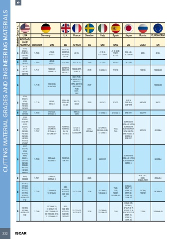 332 ISCAR CUTTING MATERIAL GRADES AND ENGINEERING MATERIALS Material Group No.USA Germany U.K. France Sweden Italy Spain Japan Russia EURONORMAISI/SAE/UNS/ASTM/AA Werkstoff DIN BS AFNOR SS UNI UNE JIS GOST EN65140;5140 H;5140 RH;G51400;H514001.7035 41Cr4;41 Cr 4530 A 40;530 M 40;530 H 40;En 1842 C 4 41 Cr 4;41 Cr 4 KB41 Cr 4 DF;F.1211;F.1202SCr 440;SCr 440 H 40Ch 41Cr46 5140;G51400 1.7045 42Cr4;42 Cr 4 530 A 40 42 C 4 TS 2245 41 Cr 4 42 Cr 4 SCr 44065115;5117;G51150;G511701.7131 16MnCr5;16 MnCr 5527 M 17;590 H 17;590 M 1716MnCr5RR;16 MC 5 2173 16 MnCr 5 F.1516 18ChG 16MnCrS56 1.7139 16MnCrS5;16 MnCrS 5BGH 7139;BOHLER E 411;VW 4221;OPEL QS1916;PROCONS 7139;E411;SES2127 16MnCrS565155;5155 H;5150;G51550;H51550;G516001.7176 55Cr3;55 Cr 3525 A 58;525 A 60;En 4855 C 3;55Cr3 2253 55 Cr 3 F.1431SUP 9;SUP 9 A;SUP 9 M50ChGA 55Cr36 4142;G41420 1.7223 41CrMo4;41 CrMo 4MOC 2;V320 41 CrMo 4 42 CrMo 4 SNB 22-1 40ChFA64140;4140 H;4140 RH;4142;4142 H;4145;G41400;H41400;G41420;H41420;K14248;K140471.7225;1.722742CrMo4;42CrMo4V;42 CrMo 4;42 CrMo 4 V708 M 40;709 M 40;En 19;En 19 A42 CD 4;40 CD 4;42CrMo4RR2244;42CrMo442 CrMo 4;38 CrMo 4 KB;41 CrMo 4TO.D;TU.LSCM 440 H;SCM 440 HRCH;SCM 440 M;SCM 440 RCH;SCM 440 TK;SNB 7 Class 2;SCM 4 H;SNB 22-140ChFA 42CrMo464147;4147 H;4150;4150 H;8650;8650 H;G41470;G41500;G86500;H41470;H41500;H865001.7228 50CrMo4;50 CrMo 4708 M 40;708 A 47 2512 653 M 31SCM 445 H;SCM 445 HRCH;SCM 445 RCH;SCM 5 H50CrMo46 8620;G86200 1.7321 20MoCr4;20 MoCr 4 2625BGH 7321;E320;SIQUAL 732120MoCr46K11547;K11562;K11564;K11757;K11789;K12052;ASTM A182 F121.7335 13CrMo4-5;13 CrMo4 4620;620-440;620-470;620-540;62115 CD 4-05 2216 14 CrMo 3;14CrMo4 5TU.E;TU.F;F.2631;14 CrMo 4 5SCMV 2;SFVA 12;STBA 22;STFA 22;STPA 20;STPA 2212ChM;15ChM 13CrMo4-56K21390;K21590;ASTM A182 F221.738010CrMo9-10;10 CrMo 9 10;GS-12CrMo9-10;GS-12 CrMo 9 10;G 12 CrMo9-12622;622-490;622/515;622/690;1502-62212 CD 9-10;10 CD 9.10 2218 12 CrMo 9;12 CrMo 10 TU.HSCMQ 4 E;SCMV 4;SFVA F 22 A;SFVA F 22 B;SFVCM F 22 B;STBA 24;STFA 24;STPA 2412Ch8 10CrMo9-10