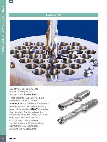 56 ISCAR GENERAL PURPOSE DRILLINGSUMO-CHAMOne of the leading drilling lines that undoubtedly deserves attention is the SUMO-CHAM. These interchangeable drill heads are user-friendly, which means the SUMO-CHAM line ensures quick and easy replacement of an exchangeable drilling head with emphasis on ISCAR%u2019s %u201cno-setup time%u201d principle. The line includes the smallest exchangeable drilling head in the market with a diameter of 4 mm (0.157 inches). These inserts are supplied with a specifically developed user-friendly key enabling easy mounting with no set-up time.