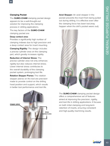 63GENERAL PURPOSE DRILLINGClamping PocketThe SUMO-CHAM clamping pocket design appears to be a well-thought-out solution for improving the clamping process in drilling applications.The key factors of the SUMO-CHAMclamping pocket are:Deep contact area:Provides a significantly high number of clamping indexes due to high precision and a deep contact area for insert mounting.Clamping Rigidity: The design includes a precise cylinder area on the clamping part, which greatly increases rigidity.Reduction of Internal Stress: The precise cylinder area not only enhances rigidity but also reduces internal stress. Lower internal stress contributes to the overall durability of the clamping pocket system, prolonging tool life.Rotation Stopper Planes: The rotation stopper planes on the tool are precision made to provide control on the drilling head position and support, which results in better tool performance and tool life. deep contact areastopper planeAxial Stopper: An axial stopper in the pocket prevents the insert from being pulled out during drilling. It is effective even after the clamping force has been lost (may happen when the drill%u2019s pocket wears out).The SUMO-CHAM clamping pocket design offers a comprehensive set of features aimed at improving the precision, rigidity, and tool life in drilling applications. It focuses on both initial clamping and long-term retention of inserts, ensuring consistent and high-quality machining results.