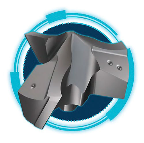 Три радіальних та три осьових стопора забезпечують точну й жорстку посадку свердлильної голівки H3P-IQ, виключаючи ймовірність її викручування або провертання в процесі обробки. Така конструкція гарантує надійність процесу свердління в умовах обробки з високою подачею. Крім того, свердла LOGIQ3CHAM показують високу ефективність під час обробки наскрізного отвору - завдяки формі ріжучої крайки та низькій осьовій силі. Унікальна геометрія самоцентрівної голівки LOGIQ3CHAM оптимально формує стружку, забезпечуючи її плавну евакуацію через три поліровані канавки з високою спіраллю (рис. 2).